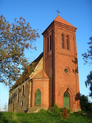 Die für den nördlichen Oderraum typische Feldsteinquader-Kirche (13.Jhd.) steht auf einem Hügel am SO-Rand. Der neugotische Turm war bis 1945 mit oktogonalem Aufsatz und geschlossener Laterne ca. 1/3 höher. Bemerkenswert: Spätrenaissance-Altar in der Restaurierung von Eginhard Dräger (Schwennenz); nach der Reformation (1534) vermauertes Südportal; barockisiert-vergrößerte Fenster, nach O original erhalten; für den alten Kreis Randow kennzeichnendes Kirchhofsportal auf der Nordseite; Schachbrettstein an der Nordost-Ecke (siehe Links); "Nordkirchen-Linde" und Gingko nordwestlich vor dem Turm.